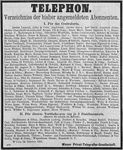 - 1881: Das erste Telefonverzeichnis Österreichs wird veröffentlicht. Es handelt sich dabei um eine Werbeeinschaltung in der Satirezeitschrift Kikeriki. Ein offizielles Verzeichnis erschien erst Ende 1881.