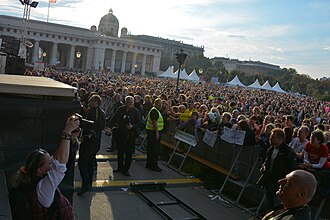 Im Anschluss daran fand auf dem geschichtsträchtigen Heldenplatz das Konzert Voices for Refugees statt. Organisiert wurde dieses Großereignis, an dem etwa 100.000 Menschen teilnahmen, vom Forchtensteiner Nova Rock-Veranstalter Ewald Tatar und dem Volkshilfe Österreich-Geschäftsführer Erich Fenninger. Für dieses Großereignis konnten Künstler wie Die Toten Hosen, Conchita Wurst oder Konstantin Wecker gewonnen werden.[10] Als einziger Politiker hielt Bundespräsident Heinz Fischer eine Ansprache[11]. Campino, der Sänger der "Die Toten Hosen", kritisierte in einer kurzen Rede[12] den FPÖ-Vorsitzenden Heinz-Christian Strache. Ein Höhepunkt der Veranstaltung war eine Schweigeminute in der an die Opfer der Flüchtlingskrise gedacht wurde.[13]