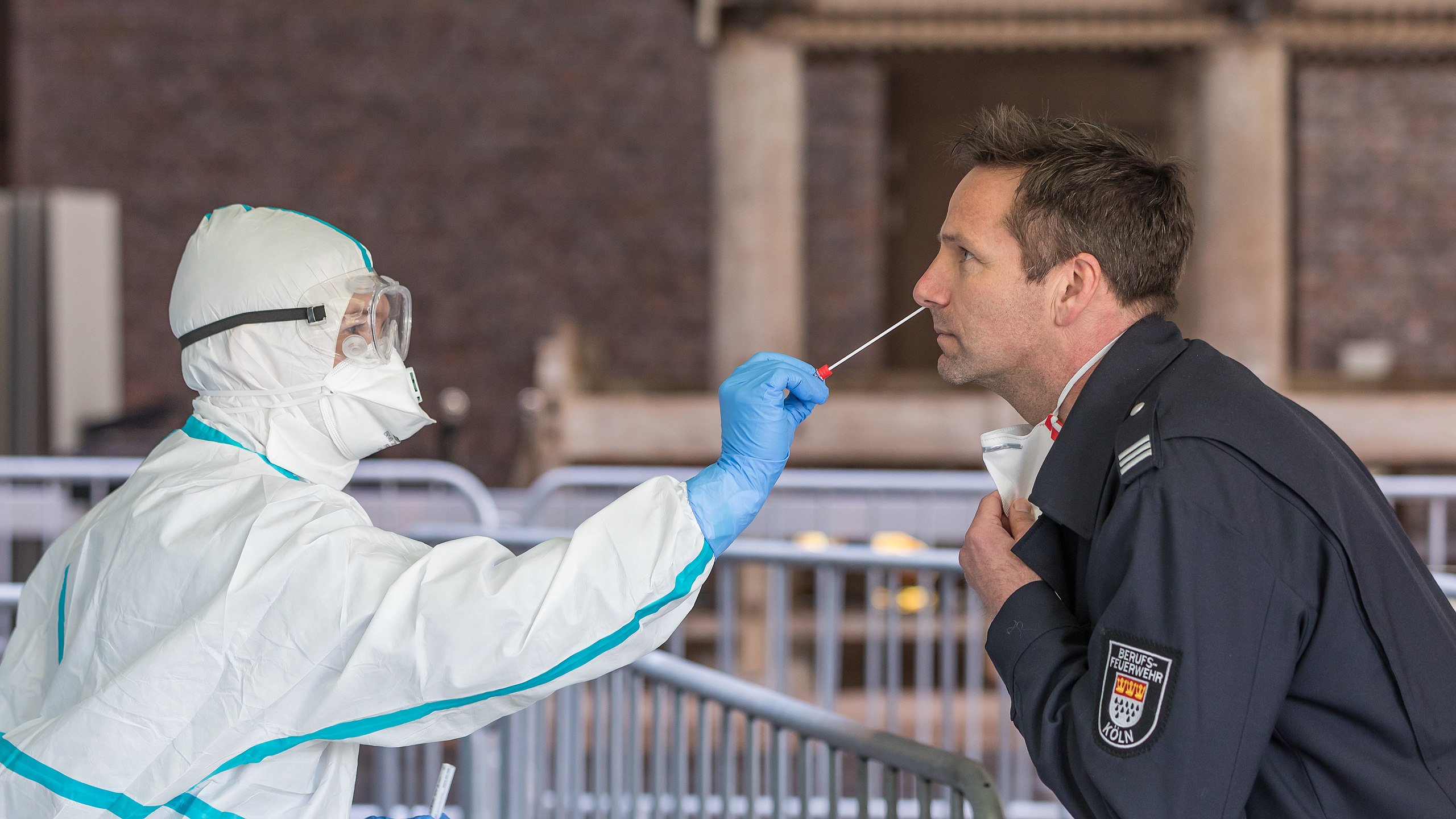 Mitarbeiter des Infektionsschutzzentrums demonstrieren an einem Feuerwehrmann, der sich als Testperson zur Verfügung stellt, wie ein Abstrich durchgeführt wird.