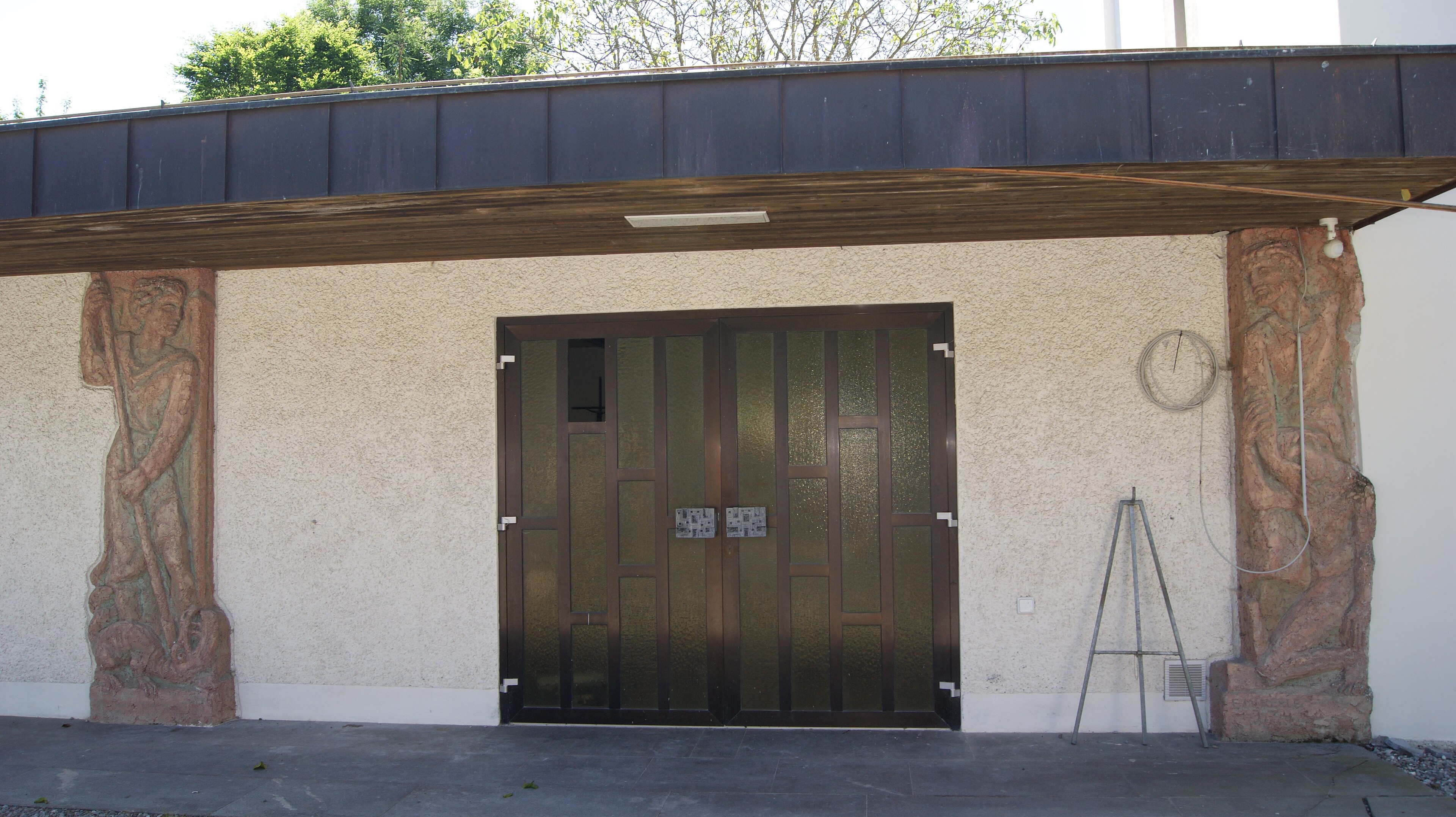 English: Parish Church St. Josef in Kennelbach (456 masl), Vorarlberg, Austria. Access to the funeral hall with Terracotta reliefs of St. George or Archangel Michael (left) and the "Prodigal Son" (right) by Emmerich Kerle (1974).