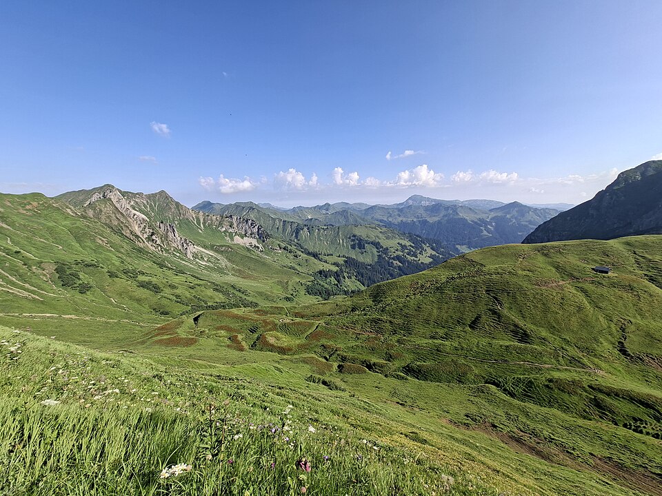 English: View from the Hoefergrat in the municipalities of Warth and Schroecken in Vorarlberg, Austria to Mittelberg (Kleinwalsertal)