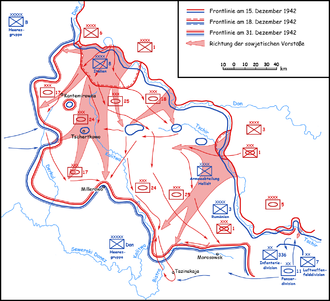 „Am 18.12.41 durchbrach der Russe die Front der Division Celere südlich Kasanskaja. Auch gelang es ihm nordwärts Kasanskaja die italienische Sicherungslinie zu durchstoßen. Teile der 298.ID sind hier zum Gegenstoß angetreten. Südlich Werchnij-Mamon wurde die italienische Front auf den Bogutschar zurückgenommen. Hier ist auch die 27.PD im Einsatz, so das OKW. Das Zurücknehmen der italienischen Front ist sicher zu linde ausgedrückt, es war mehr eine Flucht. Teile der 298.ID halten südlich Kasanskaja noch die Front und versuchen, sich auf die eigene Linie zurückzukämpfen....Die 298.ID kämpft sich bis 25.12.42 weiter nach Südwesten durch, sie konnte aus der Luft versorgt werden.“