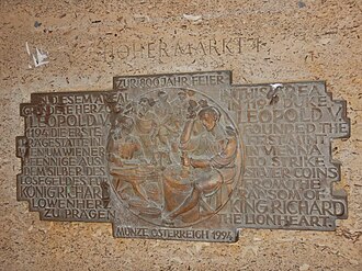 Eine Gedenktafel auf dem Platz Hoher Markt in Wien erinnert heute an die Gründung der ersten Wiener Münzprägestätte unter Herzog Leopold (V.) "dem Tugendreichen"