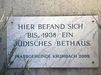 Im Zentrum Krumbachs, neben dem heutigen Gemeindehaus, befand sich bis 1938 ein jüdisches Gebetshaus, welches im Besitz der Familie Max und Miriam Blum war. Der Eingang des Gebetshauses befand sich auf der Giebelseite, rechts und links davon befanden sich jeweils zwei Rundbogenfenster. Eine schmale Tür und eine sehr steile Holztreppe führten zur Empore, welche von einem Holzgitter umgeben war. Von dort aus konnten die Frauen dem Gottesdienst beiwohnen.[2] In der Raummitte hing ein vergoldeter Holzluster und auf der Stirnseite des Gebetshauses befand sich ein großer Torbogen, der mit einem roten Vorhang verschlossen war. Dahinter befanden sich zwei Thorarollen mit Krönchen und Zeigestab.[1]