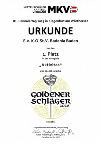 - ↑ Mittelschüler-Kartell-Verband (MKV): Pennälertag 2016 in Baden - Berichterstattung Niederösterreich Heute. 19. Mai 2016, abgerufen am 14. Jänner 2026.