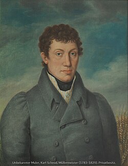 Karl Schmid (auch Carl bzw. Schmitt, Schmidt) entstammte der "Müllerdynastie Schmid" und kam 1783 auf der "Stegmühle" in Ober Liesing, damals noch ein Wiener Vorort, als sechstes Kind des Müllers Johann Michael Schmid und dessen Ehefrau Anna Maria Lindemmer zur Welt[1]. Beide Eltern stammten aus Müllerfamilien: der Vater, Sohn des Müllermeisters Johann Paul Schmid, wurde 1749 auf der Faistmühle in Hietzing geboren[2], die weiteren Vorfahren lassen sich auf Mühlen in Kaltenleutgeben und Asparn an der Zaya nachweisen. Die Mutter war eine Tochter des späteren Mühleninhabers der Waldmühle in Kaltenleutgeben, Tobias Lindemmer und seiner Frau Maria Theresia Zellmayer[3]. Deren Vorfahren waren schon davor Müller auf einer der Liesinger Mühlen.