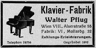 Die Klavierfabrik Walter Pflug wurde im Jahr 1892 in Wien gegründet und gehörte zur vielfältigen und traditionsreichen Klavierbaukultur der Stadt Wien.[1]
