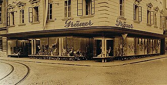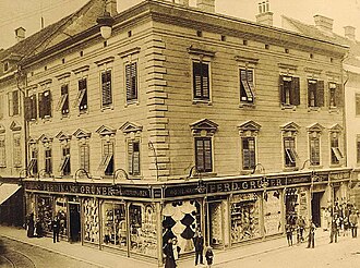 Mit dem Jahre 1887 beginnt die Geschichte der Firma Ferdinand Grüner. Im August 1887 wurde das Haus Burggasse 17 Bahnhofstraße 14 vom Kaufmann Ferdinand Grüner um den Betrag von 21.000 Gulden erworben. Auch er musste bis auf 8.000 Gulden Hypothekarschulden übernehmen. Ferdinand Grüner, der im Jahr 1868 die Firma Grüner & Homschack, am heutigen Neuen Platz Nr. 8 gründete, übersiedelte in sein eigenes Haus und eröffnete ein Galanteriewarengeschäft, welches er unter dem Namen Ferdinand Grüner alleine weiterführte. Das Geschäft erfreute sich alsbald eines guten Rufes.