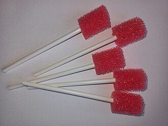 Unter dem Begriff Mundschwamm (auch: Mundpflegeschwamm, Oralschwamm, Mundhygieneschwamm, Mundhygienestäbchen, Mundpflegestäbchen[9]) werden Stäbchen, an deren Ende sich ein Schwamm aus Kunststoff befindet bezeichnet. Diese dienen der sanften Reinigung z. B. der Mundhöhle, der Zähne, des Zahnfleisches oder der Befeuchtung der Mundhöhle z. B. bei Zahnempfindlichkeit oder Krankheiten.