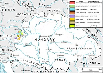 Nach dem Tod des ungarischen Königs Ladislaus Postumus († 1457) kam es zu einer Doppelwahl. Während es der Familie von Matthias Corvinus 1458 gelang, diesen zum neuen ungarischen König wählen zu lassen, bot ein Teil der ungarischen Landstände Kaiser Friedrich III. die ungarische Krone an. Dieser wurde am 14. Februar 1459 von 24 ungarischen Adeligen (Magnaten) auf Burg Güssing (heute Teil der Gemeinde Güssing) ebenfalls zum ungarischen König und damit als Gegenkandidat zum regierenden König Matthias Corvinus gewählt.[1] Nachdem bereits 1462 verhandelt worden war, wurde der "Vertrag von Wiener Neustadt" im Juli 1463 durch Vermittlung von Papst Pius II. (Enea Silvio Piccolomini) zwischen Kaiser Friedrich III. und König Matthias Corvinus geschlossen, nachdem bereits 1462 verhandelt worden war. Friedrich III. verzichtete "de facto" auf die ungarische Krone und anerkannte Matthias Corvinus als ungarischen König an, durfte aber weiterhin nominell den Titel des ungarischen Königs führen. Zudem sicherte er sich das Recht auf die Thronfolge im Falle des erbenlosen Todes des Matthias Corvinus. Vereinbart wurde die Rückgabe der Stephanskrone, die sich seit vielen Jahren "de facto" im Besitz des Kaisers befand, an Matthias Corvinus.[2] Dafür verpflichtete sich dieser dem Kaiser gegenüber zur Zahlung einer hohen Geldsumme. Weitere Bestimmungen betrafen die Herrschaften Forchtenstein, Kobersdorf, Eisenstadt, Güns und Rechnitz, welche damals im Ungarischen Königreich lagen, aber sich schon länger im Besitz des Kaisers befanden. Ihr Besitz wurde dem Kaiser durch den Vertrag bestätigt. Gleichzeitig versuchte der Kaiser sich durch diese Bestimmung vor weiteren Grenzstreitigkeiten abzusichern.[3] Im Vertrag wurde außerdem die Nachfolge der Habsburger im ungarischen Königreich festgelegt, für den Fall, dass Matthias Corvinus keine legitimen männlichen Erben hinterlassen sollte.[4]