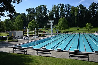 • Das Becken des 1965 eröffneten Freibades gilt mit 23.000 m² Wasserfläche als das größte Badebecken Europas.