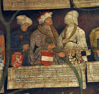 - Hofburg: Sie gilt als die von Albrecht III. bevorzugte Residenz.[16] Auf dem bekannten Habsburger-Stammbaum von Konrad Doll (entstanden um 1496 in Tirol), der sich heute als Teil der Sammlungen des Kunsthistorischen Museums in der Hofjagd- und Rüstkammer der Neuen Burg befindet, ist der Herzog zusammen mit seinem beiden Ehefrauen dargestellt. Auf diesem wendet er seiner ersten Ehefrau den Rücken zu und scheint sich vollkommen seiner zweiten Ehefrau zu widmen. Durch den grünen Zweig und ihren Halsschmuck, zwei blonde, geflochtene Zöpfe, wird die Zugehörigkeit der beiden als Paar noch vesrstärkt.[21]