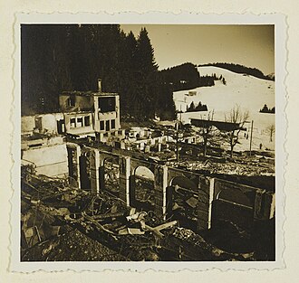 Kurz vor dem Anschluss Österreichs an das Deutsche Reich (11./12. März 1938), am 3. Februar 1938, brannte der Komplex Alpenhotel Bödele fast vollständig ab.[9] Erhalten ist bis heute der Felsenkeller und sieben relativ unscheinbare Garagen