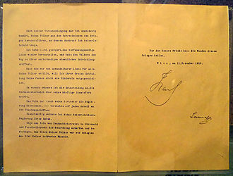 Kaiser Karl I. unterschrieb am 11. November 1918 auf Drängen von Politikern, wie dem Staatskanzler Karl Renner, eine Erklärung, in welcher er auf jeden Anteil an den Staatsgeschäften in der österreichischen Reichshälfte verzichtete. Am 13. November kam er dem Wunsch von ungarischen Politikern nach und unterzeichnete eine ähnliche Erklärung für die ungarische Reichshälfte. In beiden Fällen sah er diesen Akt aber nicht als Abdankung an, zumal die Armee noch auf ihn vereidigt blieb. Karl zog sich in weiterer Folge auf Schloss Eckartsau im Marchfeld zurück, wo er von der britischen Armee beschützt wurde. Am 23. März 1919 verließ Karl zusammen mit seiner Familie aufgrund des in Kürze in Kraft tretenden Habsburgergesetzs Österreich in Richtung Schweiz. Am nächsten Tag, vor dem Grenzübertritt in die Schweiz, widerrief er im Feldkircher Manifest seine Erklärung vom 11. November 1918 und protestierte gegen seine Absetzung als Herrscher.[1]