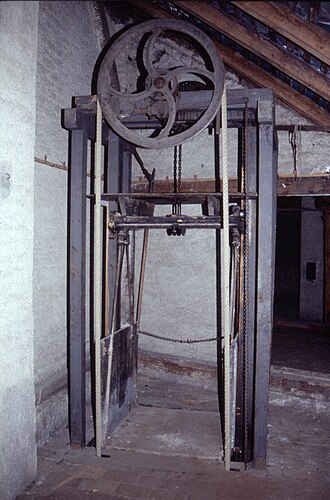 Das Foto zeigt den nicht mehr existierenden handbetriebenen Lastenaufzug der Firma Füglister im ehemaligen Kaufhaus Paur in Heiligenkreuz (NÖ), der beim Bau des Hauses im Jahre 1903 eingebaut wurde und bis zum Abriss des Hauses im Jahr 2005 durch über 100 Jahre wartungsfrei funktionierte.