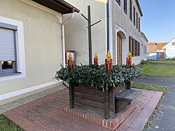 Der Jirglbrunnen, Ausgangspunkt des Brunnenwanderwegs, im Winter mit einem Adventkranz geschmückt