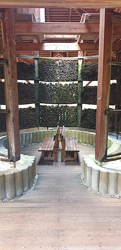 Im Mittelpunkt der Gradieranlage befindet sich der ein offener zylindrischer geformter Pavillon. In diesem Pavillon befinden sich zwei Bänke zum hinsetzten. Der Pavillon ist etwa drei Meter hoch und hat den selben Durchmesser. In dieser Form ist am Boden das Auffangbecken für das Salzwasser, welches über die Zweige herabtropft. Über den Zweigen verläuft ein Schlauch, aus welchem das Salzwasser tropft. Dieses Salzwasser sickert, dann durch die Buchenzweige und Tannenreisige, und verdunstet zum Teil. Diese dabei entstehende "Meeresluft" macht die Luft kühl und fördert die Gesundheit. [2]