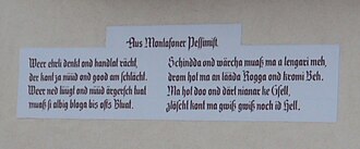 Weer ehrli denkt ond handlat rächt, / der kont za nüüd ond good am schlächt. / Weer ned lüügt ond nüüd ärgersch duat, / muaß si albig bloga bis ofts Bluat.
