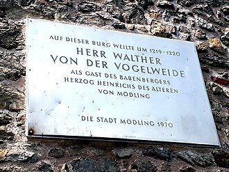 Die Burg Mödling könnte ein Nachfolgebau des Hofes Medilihka gewesen sein, der in einer Urkunde des Hochstiftes Passau im Jahr 903 genannt ist. Der Hof, der vermutlich während der Ungarn-Einfälle zerstört wurde, lag aber nicht an der Stelle, wo sich die heutige Ruine erhebt, sondern innerhalb der Stadt Mödling.[1] 1060 war die Burg vorübergehend der Zufluchtsort für die Familie des ungarischen Königs Andreas (I.) († um 1060), welche auf dieser von Graf Diepold (II.) von Vohburg († 1078) Aufnahme fand. Bereits Anfang des 12. Jahrhunderts dürfte die Burg in den Besitz der Babenberger gekommen sein. 1114 war die Burg Otto von Mödling als Burggrafen anvertraut, in den Jahren danach einem Heinrich von Mödling und dann dem Kuenringer Rapote (I.) von Schönberg (genannt zwischen 1143 und 1180), der vielleicht ein Sohn dieses Heinrichs war. Auf ihn folgte sein Sohn Konrad, mit dem diese Mödlinger Burggrafenreihe endet. Im letzten Drittel des 12. Jahrhunderts und zu Anfang des 13. Jahrhunderts war die Burg die Residenz von Herzog Heinrich (I.) von Mödling ("dem Älteren") († 1223) und seinem gleichnamigen Sohn († 1236), die beide eine Nebenlinie der Babenberger bildeten.[3] 1219 soll sich auf Burg Mödling der Minnesänger Walther von der Vogelweide († um 1230) für längere Zeit aufgehalten haben. Nach dem Tod von Herzog Heinrich von Mödling "dem Jüngeren" kam die Burg 1236 in den Besitz von Herzog Friedrich (II.) von Österreich ("Friedrich dem Streitbaren") († 1246).[1]