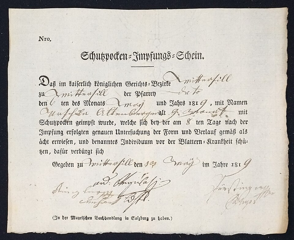 English: Protective smallpox vaccination certificate from 1819 issued by Dr Karl Pürstinger district doctor in Zell am See, Pinzgau, Salzburg, Austria