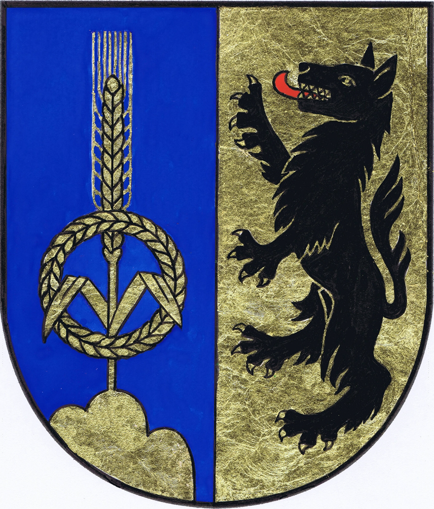 | Blasonierung InfoField | Deutsch: „In einem von Blau zu Gold gespaltenen Schild vorn golden aus Dreiberg wachsend ein mit einem goldenen Ährenkranz belegter zweifach beblätterter Getreidehalm, hinten steigend ein schwarzer, rot bezungter Wolf.“ |