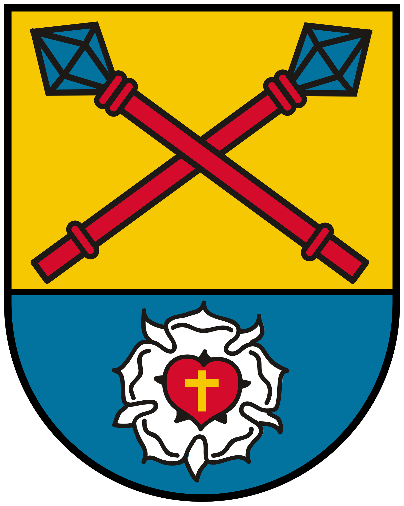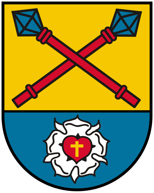 | Blasonierung InfoField | Erniedrigt geteilt; oben in Gold zwei schräggekreuzte Streitkolben mit roten Stielen und blauen Köpfen, unten in Blau eine silberne heraldische Rose, belegt mit einem roten Herz, darin ein goldenes Kreuz. | |||||||||||