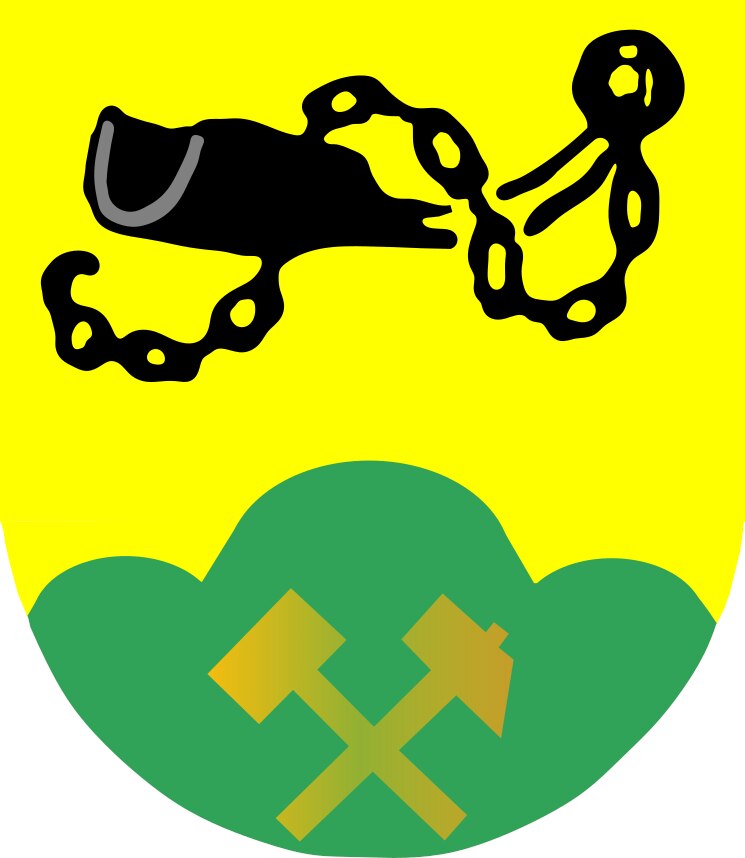 Deutsch: Wappen der Gemeinde Trieben, Steiermark, Österreich; seit 15. Mai 1956 Das Triebener Wappen zeigt im goldenen Schild einen grünen Dreiberg, mit gekreuzten goldenen Berghämmern, Schlegel und Eisen belegt. Darüber einen Radschuh mit Kette und Haken.
