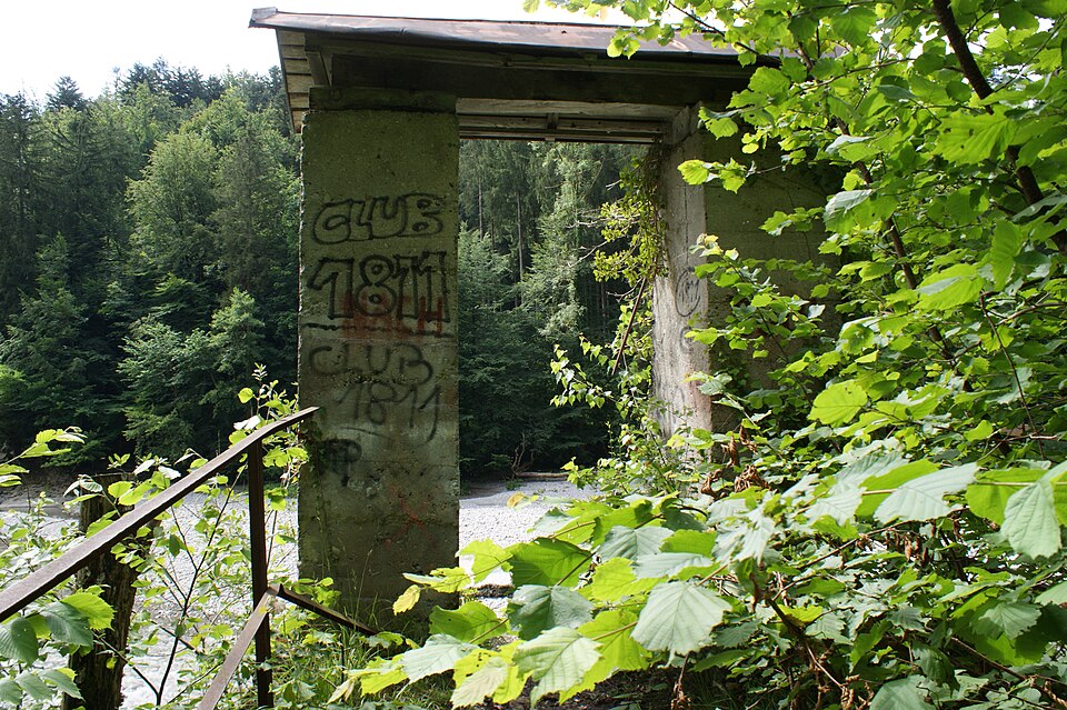 Deutsch: Ehemalige Trasse der Bregenzerwaldbahn zwischen der Gemeinde Kennelbach und Doren (Vorarlberg, Österreich). Die Trasse ist sehr weitgehend stark verfallen und im Jahr 2020 kaum noch begehbar. Reste des ehemaligen Drahtseilstegs (Hängebrücke) von Langen nach Buch.
