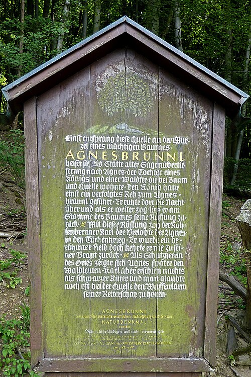 Deutsch: Das Agnesbründl befindet sich im Wienerwald, nordwestlich der Jägerwiese am Hermannskogel. Die Quelle, die ursprünglich schon unter anderen Namen bekannt war, erlangte im 19. Jhdt. Bekanntheit. Zeitweilig wurde der Platz kultisch verehrt und ist heute ein Naturdenkmal. Das Bild zeigt die Informationstafel mit einer Legende. English: "Agnesbründel" (spring of Agnes) is located in the Vienna Woods, north west of Jägerwiese on Hermannskogel. The spring achieved prominence in the 19th century, although it had already been known under different names before. For a time, the place was worshipped. Today it is a natural monument. The picture shows the information board with a legend about the place. |