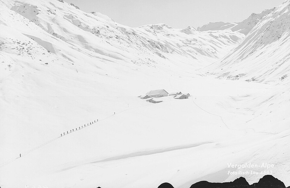 Deutsch: Alpe Vergalden im Vergaldatal im Ortsteil Gargellen in der Gemeinde Sankt Gallenkirch in Vorarlberg, Österreich. Zu sehen sind die Berge: Kuchenberg, Vorderberg, Mittelberg, Silvretta.