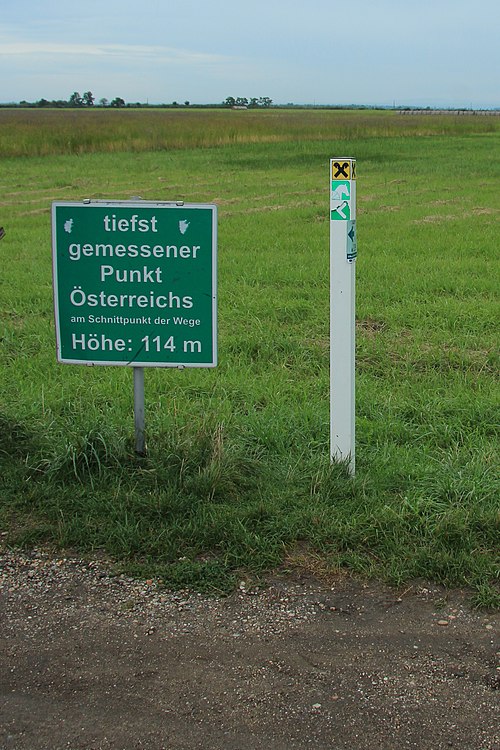 Deutsch: Apetlon, Trigonometrischer Punkt am tiefsten Punkt Österreichs mit 114 Meter |