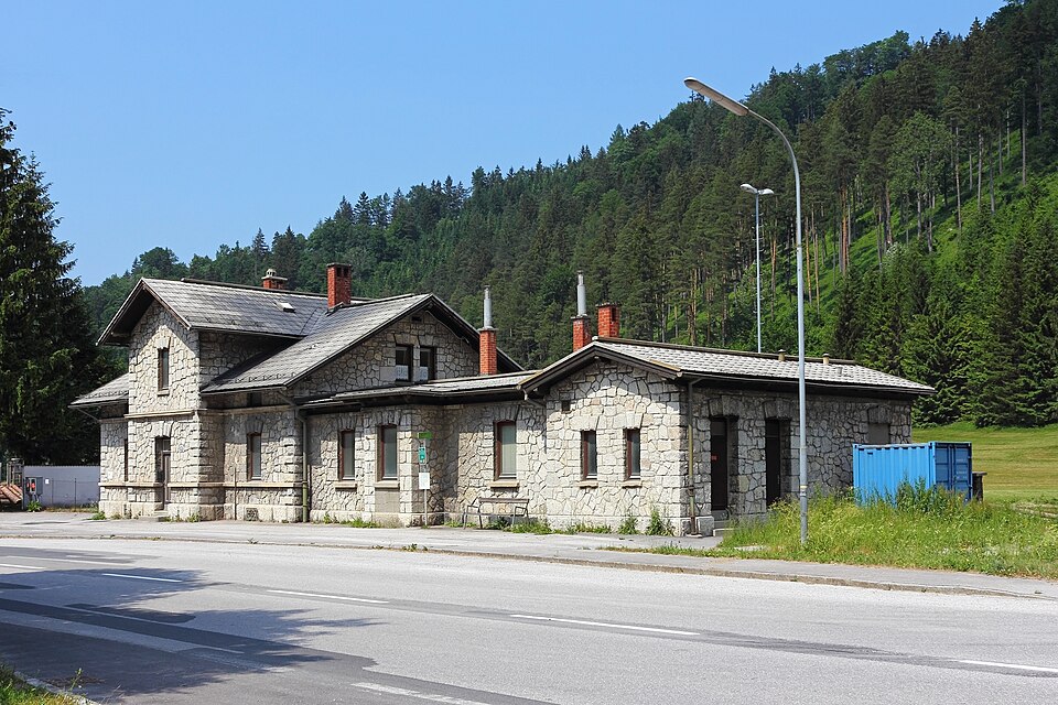 Deutsch: Der Bahnhof in Freiland ist ein um 1893 errichter, mehrteiliger Bau aus Naturstein. |