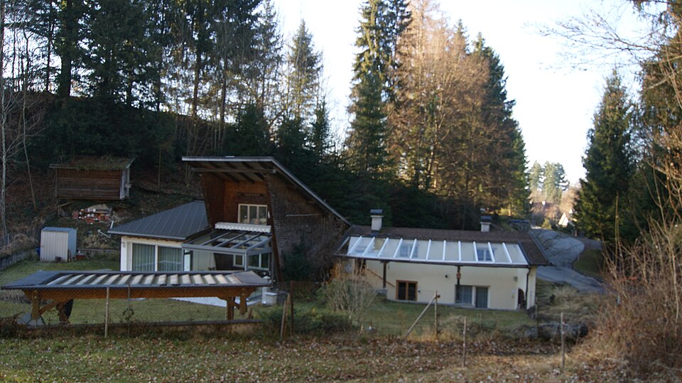 English: Bottom station of the Experimental ropeway Batschuns (municipality of Zwischenwasser) by Karl PETER (ca. 683 - 825 m.ü.A.), existed from 1947 to 1962/63. Now a home. |