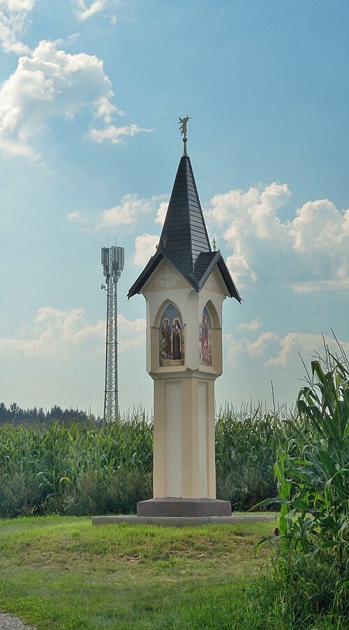 Deutsch: Westlich des Ortes St. Martin, Teil der Gemeinde Ruden in Kärnten, steht der lt. Kagis bezeichnete Bildstock beim Dürrnwirt hart an der Grenze zu Völkermarkt. Die Nischenbilder wurden 2020 neu erstellt / renoviert und sind mit PM signiert. |