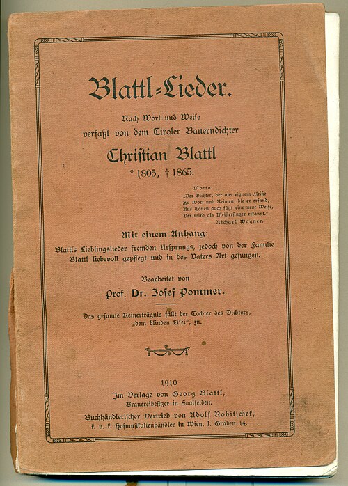 | aktuell | 10:32, 24. Feb. 2017 | 3.753 × 5.237 (5,36 MB) | commons>Leukentaler | {{Information |Description ={{en|1=The songbook from Christian Blattl II.}} {{de|1=Das Buch mit den Liedern von Christian Blattl dem Jüngeren}} |Source =Museum St. Johann in Tirol |Author =Josef Pommer |Date =2017-02-24 |P... |