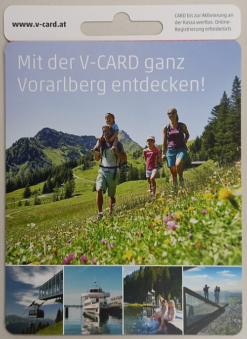 English: Discharge card "Vorarlberg card (V-card) of Vorarlberg Tourism. Sales pack