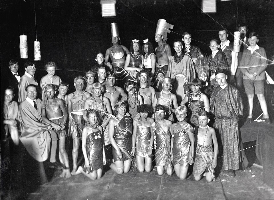 English: Interior view of the theatre hall of Schule am Meer on the East Frisian island of Juist in Prussia, erected by Berlin-based architect Bruno Ahrends (1878–1948). Costumed teachers and students include as 2nd from the left (sitting): Eduard Zuckmayer (1890–1972). Behind him standing: Anni Reiner (1891–1972), née Hochschild. On her left her husband Dr. Paul Reiner (1886–1932). In the front row standing on the right is principal Martin Luserke (1880–1968). Slightly left of the picture's centre stands the student Ulrich Sild (1911–1937), bare torso, wearing a necklace and a headband.