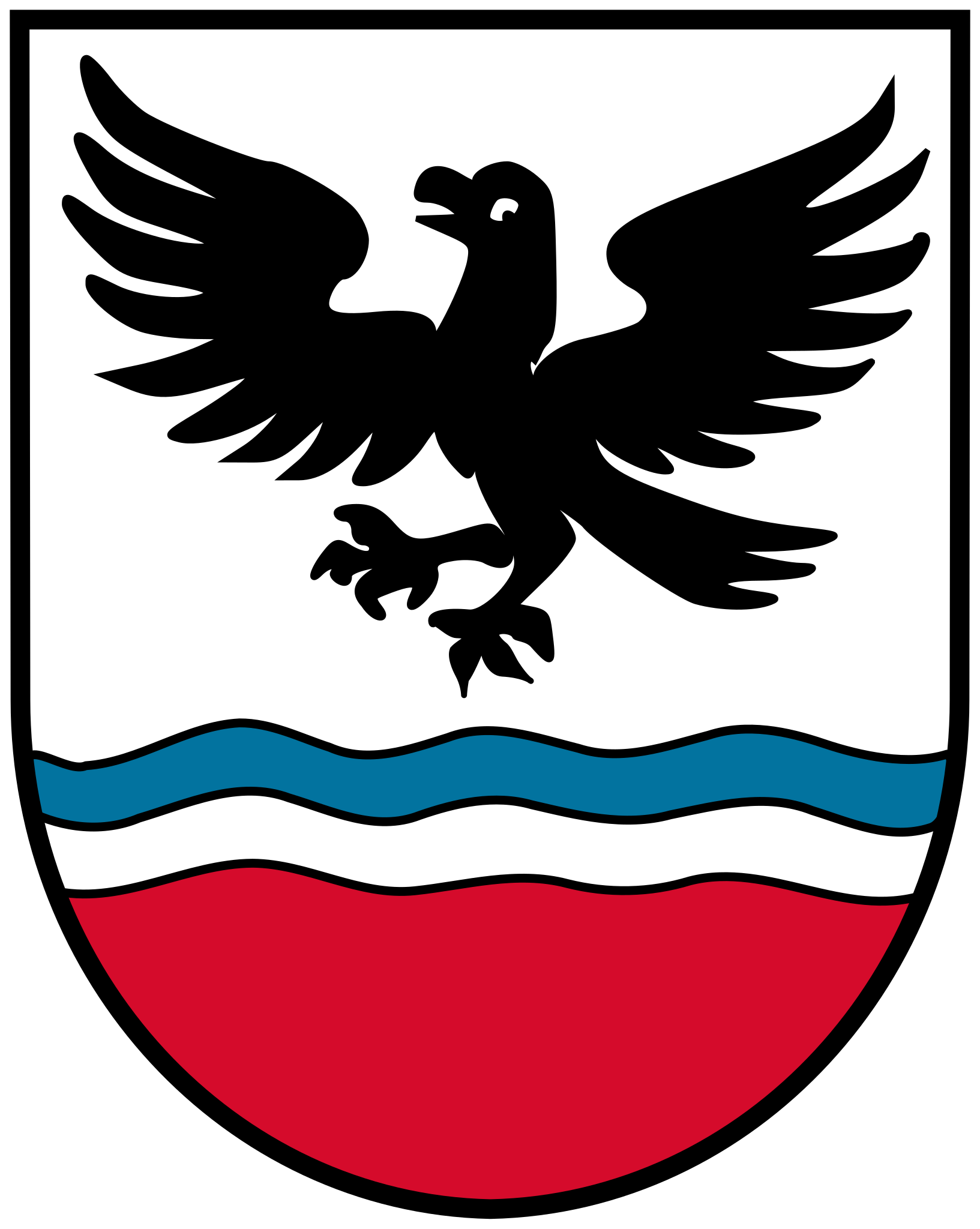 | Blasonierung InfoField | Deutsch: Durch einen blausilber geteilten Wellenbalken erniedrigt geteilt; oben in Silber ein flugbereiter schwarzer Rabe, unten Rot |