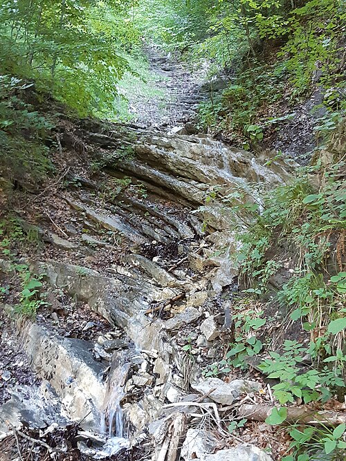 English: The "Molatobel" (also partially called "Valmala") is an approximately 2 km long side valley of the Frödischtal (valley) on the shadow side of the Frödischtal (to the south). It starts around 1343 masl and ends in the Frödischtal at about 679 masl (18.37 ° gradient or 33.2%). The term "Valmala" comes from the Romansh and means "bad valley".