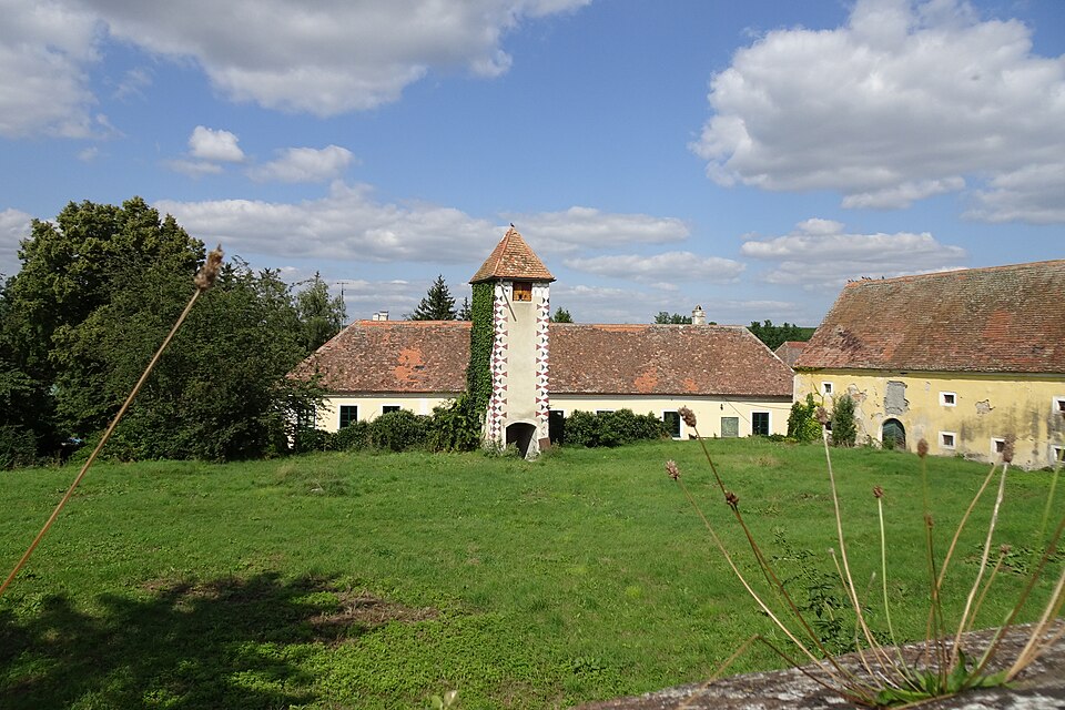 Deutsch: Anlage Schloss Deinzendorf mit östlich liegendem Wirtschaftsgebäude, Blick über die Mauer