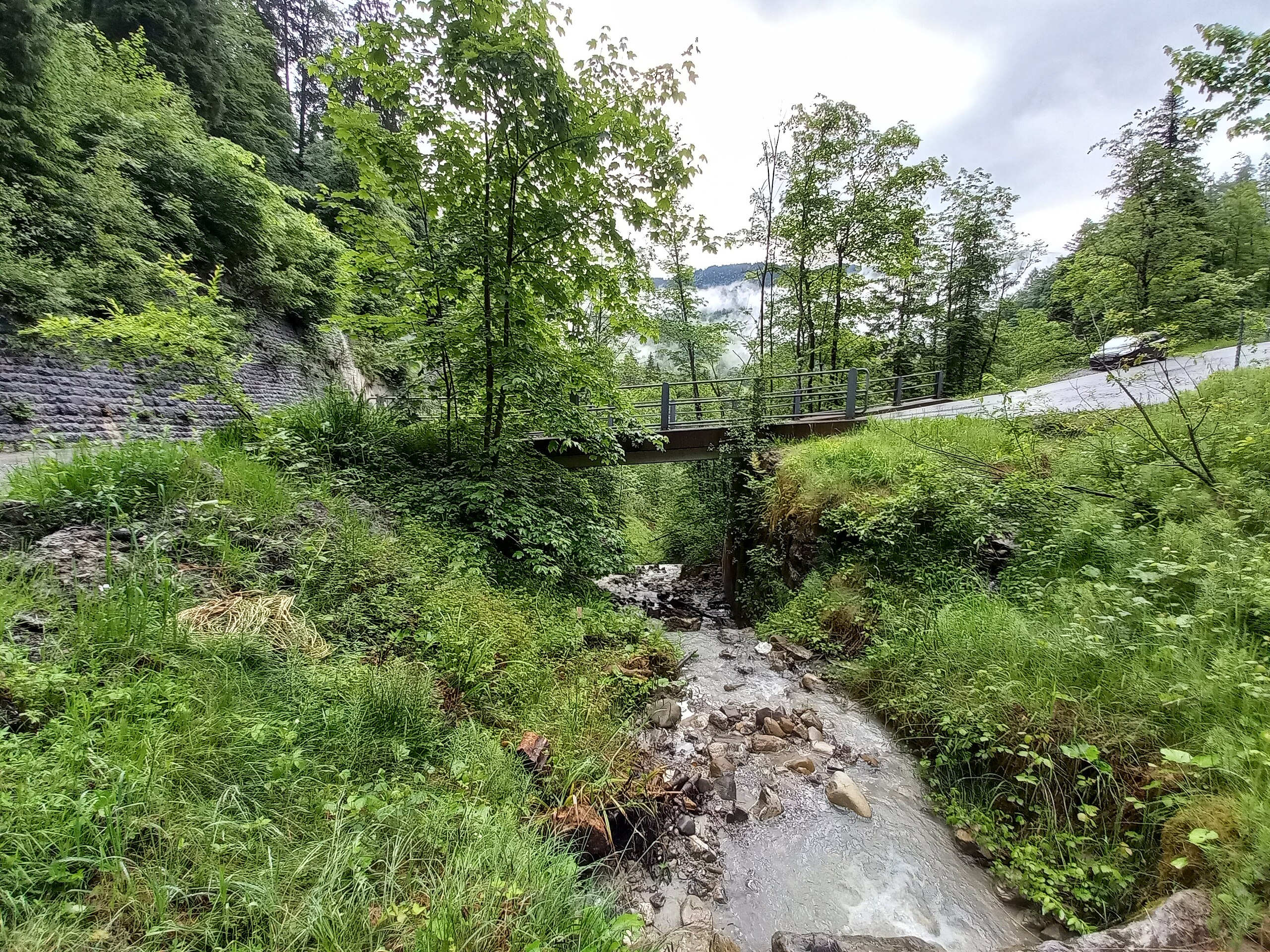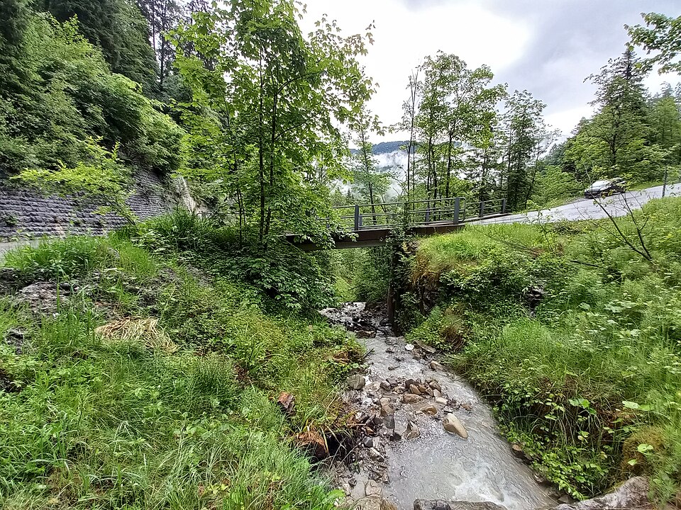 Deutsch: Alpriesebrücke an der Ebniterstraße in Dornbirn, Vorarlberg, Österreich. Überbrückt den Alpriesebach. Links ein Teil der Konsolidierungssperre Alpriese