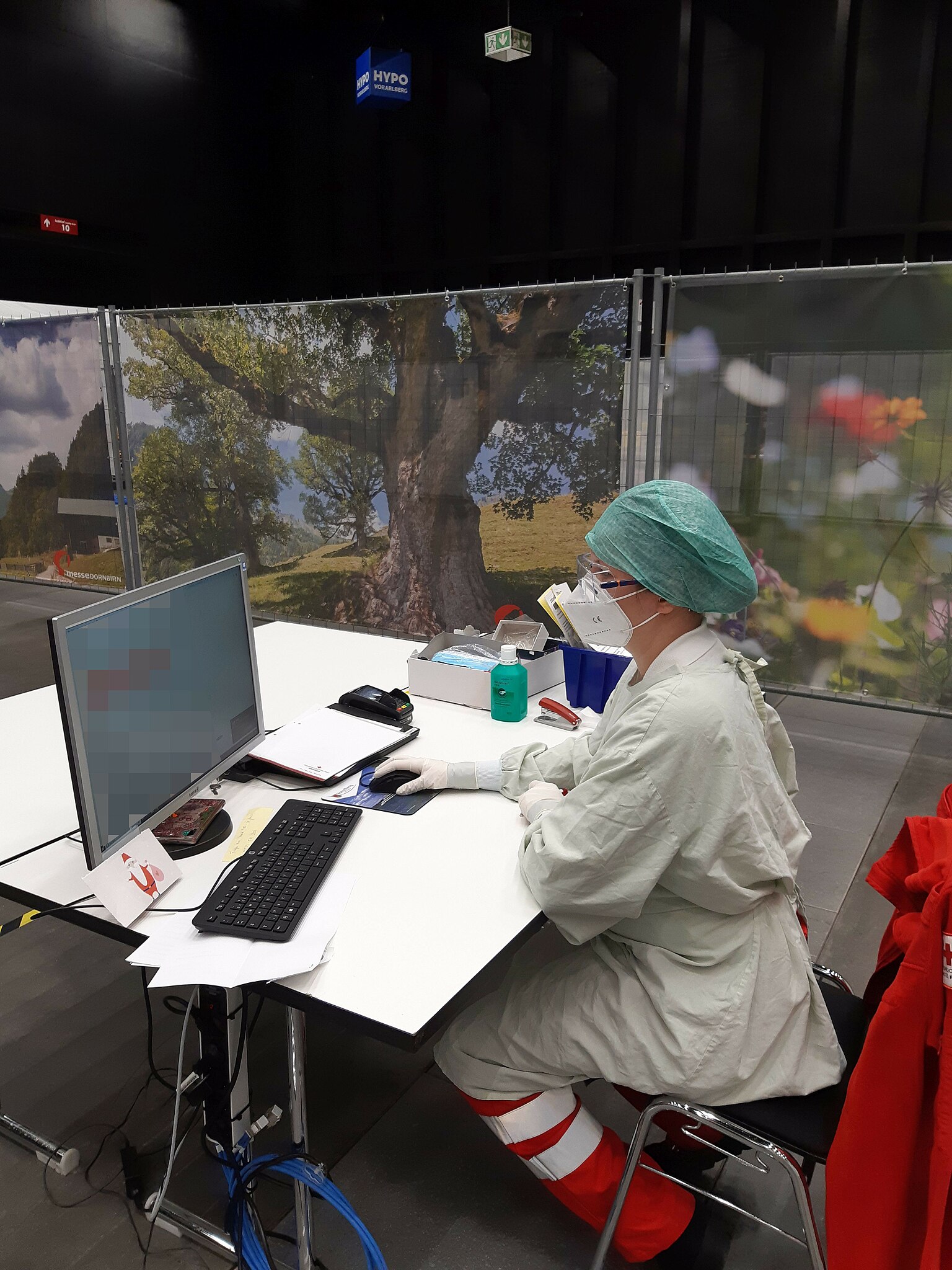 English: COVID-19 test center in Dornbirn, Vorarlberg, Austria. Registration in the test center.