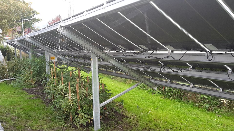 Deutsch: Photovoltaikanlagen können zum Gärtnern/Gartenbau eingesetzt werden um empfindliche Pflanzen (hier z.B. Tomaten) zu schützen. Agrovoltaik, Agro-PV, Agrar-PV. |