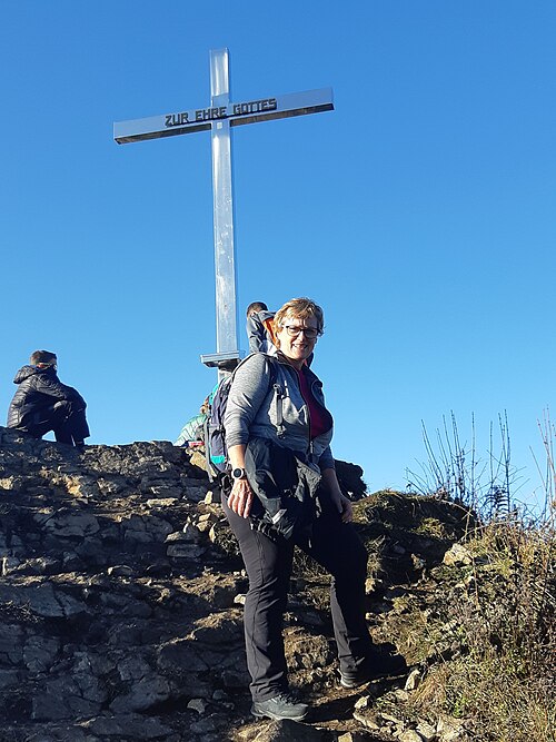 Deutsch: Gipfelkreuz auf dem Hauptgipfel des Staufen (Bregenzerwaldgebirge) in Dornbirn, Vorarlberg, Österreich. 1465 m.ü.M. Im Bild die Naturfreunde-Wanderführerin Monika Marte.