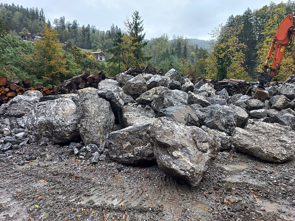 Wasserbausteine auf dem Holzlagerplatz Waldfried beim Gütle in Dornbirn, Vorarlberg, Österreich