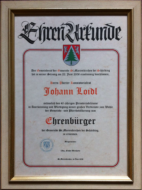 Deutsch: Ehrenbürgerurkunde der Gemeinde St. Marienkirchen bei Schärding für Konsistorialrat Johann Loidl (* 1941), Pfarrer von St. Marienkirchen 1980 bis 2014.