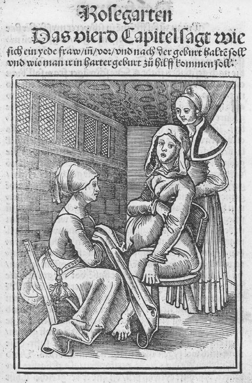 4th Chapter illustration, a woman giving birth on a birth chair. From: Eucharius Rößlin, ''Der Swangern frawen vnd hebamme(n) roszgarte(n)''. Hagenau: Gran, um 1515. (First edition: 1513, this is from one of two versions of the 2nd edition). the „