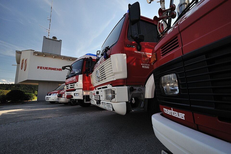 Deutsch: Die Fahrzeuge der Freiwilligen Feuerwehr Regau vor den Toren des Feuerwehrhauses