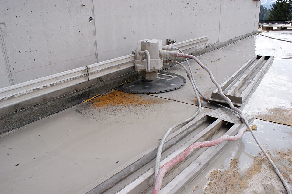 Deutsch: Betonsäge in Faschina, Vorarlberg, Österreich. Die Säge teilt eine Brüstung zum Abbruch. Die Schmierung und Kühlung des Sägeblattes erfolgt mit Wasser.