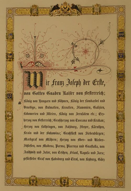 | aktuell | 12:02, 6. Mär. 2012 | 550 × 800 (91 KB) | commons>AndreasPraefcke | {{Information |Description=Erste Seite des Februarpatents von 1861; ÖSTA/AVAFHKA/Urkundensammlung/1095 |Source=http://oesta.gv.at/site/cob__42249/5164/default.aspx |Date=1861 |Author={{unknown}} |Permission= |other_versions= }} {{PD-old-100}} [[Categ... |